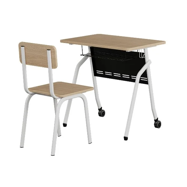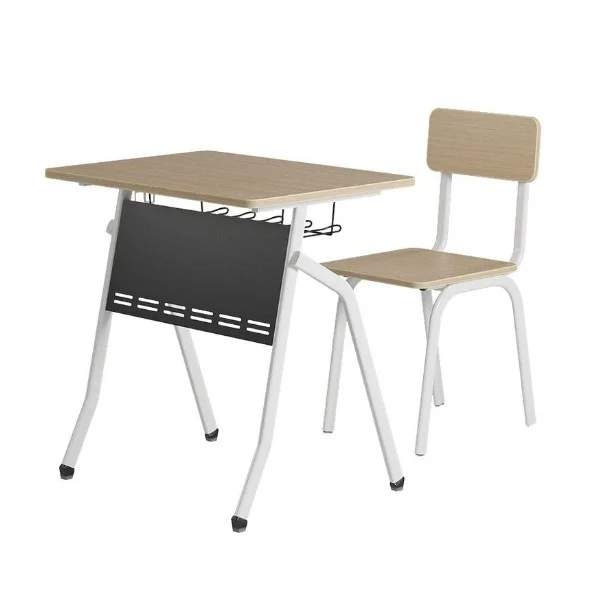 Bàn ghế học sinh bằng thép sơn màu trắng, phần gỗ và ghế bằng gỗ melamine hoặc gỗ tự nhiên.