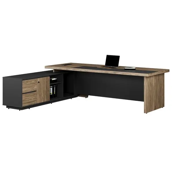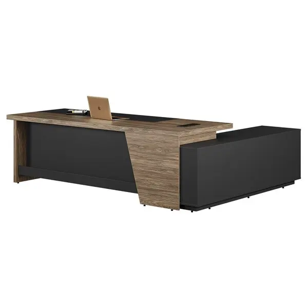 Bàn lãnh đạo cao cấp, chất liệu gỗ công nghiệp, mặt bàn được phối cùng tấm gỗ đen tạo điểm nhấn.