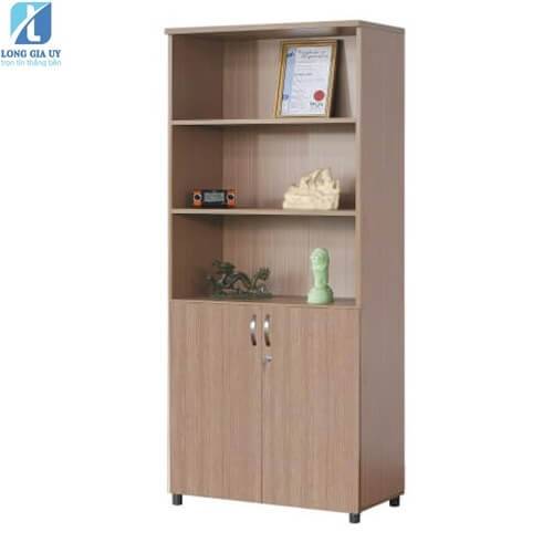 Tủ gỗ cao có 5 ngăn và 4 đợt, 2 cánh lửng bên dưới, tủ có 1 khóa.