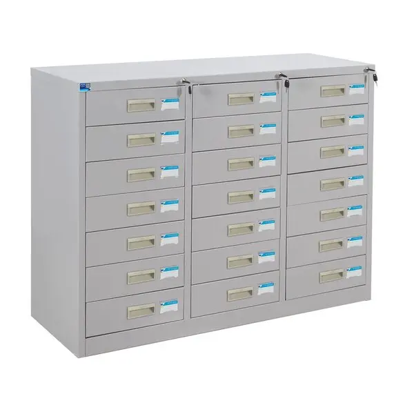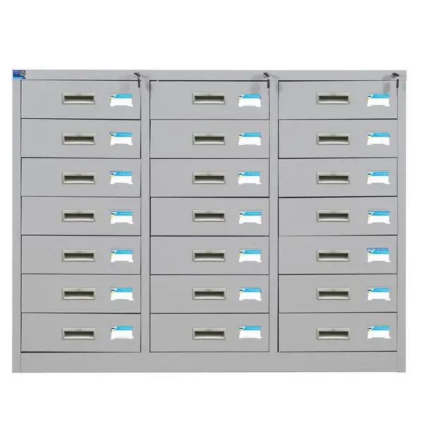 Tủ sắt sơn tĩnh điện gồm 3 khoang, mỗi khoang có 7 ngăn kéo, dùng chung 1 thanh khóa dàn.