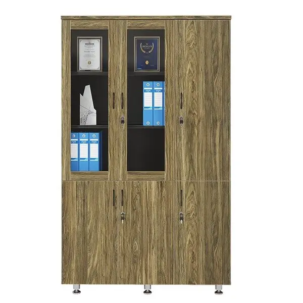 Tủ tài liệu 3 khoang gỗ Melamine, phía trên gồm 2 khoang khung cánh khung kính để tài liệu.